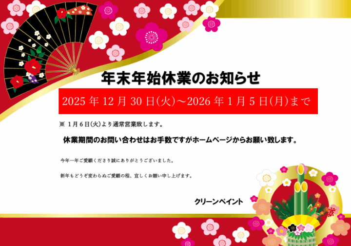 ðã¯ãªãŒã³ãã€ã³ã幎æ«å¹Žå§äŒæ¥ã®ãç¥ããð ãã€ãã¯ãªãŒã³ãã€ã³ãããã°ãã芧ããã ããããããšãããããŸãã èª ã«åæã§ã¯ããããŸããã12æ30æ¥(ç«)ïœ1æ5æ¥(æ)ã®æéã幎æ«å¹Žå§ã®ãäŒã¿ãããã ããŸãã çæ§ã«ã¯ãäžäŸ¿ããããããããŸããããçè§£ã®ã»ã©ããããããé¡ãããããŸãã 2026幎ãã¯ãªãŒã³ãã€ã³ãã¹ã¿ããäžå å°åã®ã客æ§ã«ãæºè¶³ããã ããå€å£å¡è£ ã»å±æ ¹å¡è£ å·¥äºãè¡ã£ãŠãŸãããŸãâš ä»åŸãšãåºå³¶åžã»å»¿æ¥åžåžã®å€å£å¡è£ ã»å±æ ¹å¡è£ å°éåºã¯ãªãŒã³ãã€ã³ããå®ãããé¡ãç³ãäžããŸãã ãªãã2026幎1æ6æ¥ä»¥éã®ãäºçŽããåãåããã¯äžèšãããäŸé Œãã ããð ãé»è©±ã§ãåãåããã¯ãã¡ã WEBã§æ¥åºäºçŽã¯ãã¡ã ãèŠç©ãäŸé Œã¯ãã¡ã å¡è£ å°éåºã¯ãªãŒã³ãã€ã³ãã®ã·ã§ãŒã«ãŒã ãªã¬ã³ãžðè²ã®çæ¿ãç®å°âš å€å£å¡è£ ã»å±æ ¹å¡è£ ã®äºãªãã¯ãªãŒã³ãã€ã³ããžãªãã§ããçžè«ãã ããð å¡è£ å®çžŸ38å¹Žã»æœå·¥å®çžŸ7,500件以äžð åºå³¶åžã»å»¿æ¥åžåž å°åå¯ç å€å£å¡è£ ã»å±æ ¹å¡è£ å°éåºã·ã§ãŒã«ãŒã open ãšã¹ã±ãŒåç ç»é²æœå·¥åº / 21幎é£ç¶åªè¯åºèªå®ð ã¯ãªãŒã³ãã€ã³ãèªæ ¢ã®ãæœå·¥äºäŸããæ¯éã芧ãã ããïŒ åºå³¶ã§å£ã³ãNO.ïŒïŒãã客æ§ã®å£°ããã¯ãªãŒã³ãã€ã³ãã®èªãã§ãïŒ åºå³¶ã§æå€§çŽã®å¡è£ å°éã·ã§ãŒã«ãŒã ãžã®ãæ¥åºäºçŽãã¯ã³ãã©ããïŒ â 話ããèãã ãã§ãOKðãâ ãèŠç©ããã ãã§ãOKð ãŸãã¯ç¡æèšºæããð ãåãåããã¯ãã¡ã â ç¡æãèŠç©äŸé Œã»ãåãåãã ç¡æå±æ ¹å€å£èšºæ ç¡æéšæŒèšºæ æœå·¥äºäŸ â https://ch9400.jp/works/ ã客æ§ã®å£° â https://ch9400.jp/voice/