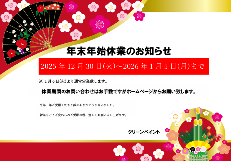 🎍クリーンペイント年末年始休業のお知らせ🎍