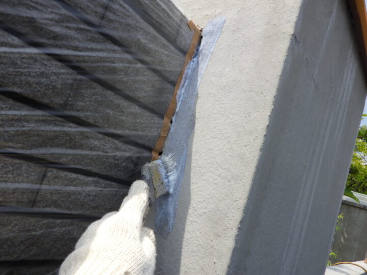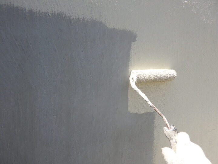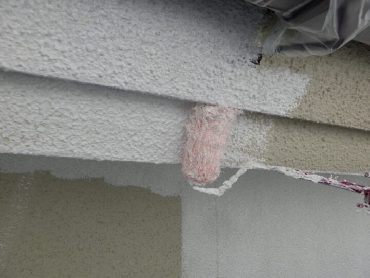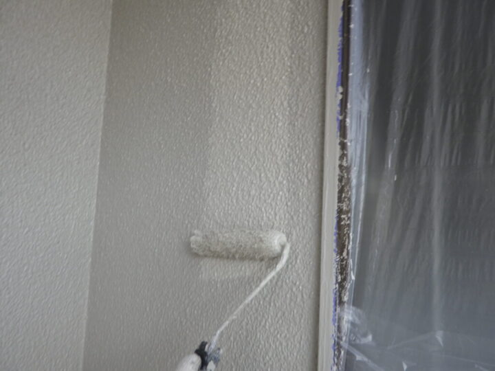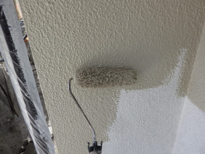 モルタル壁専用の下塗り材で下塗りを行います。④外壁上塗り 一回目