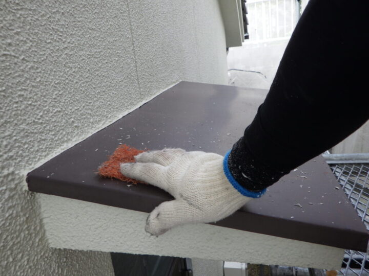高圧洗浄後はヤスリなどを使い、鉄部や木部に付いている汚れを落とします。②鉄部錆止め塗布