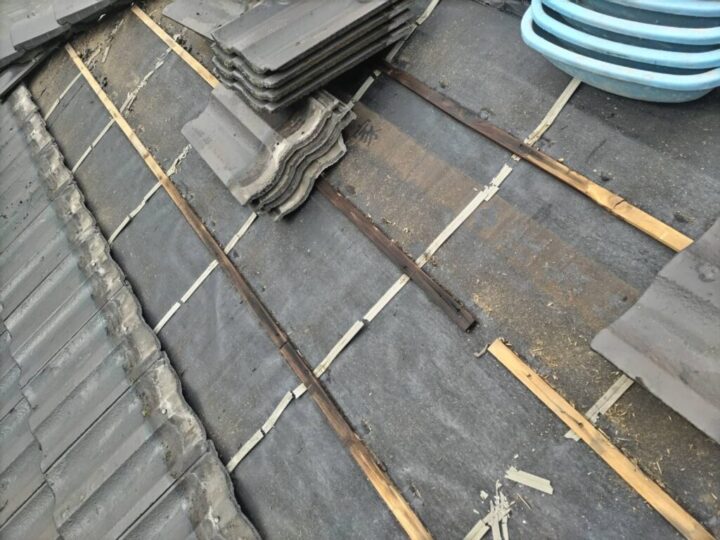 【桟木とは:瓦を引っ掛けるために屋根の上に横方向に張り渡す角材の事】