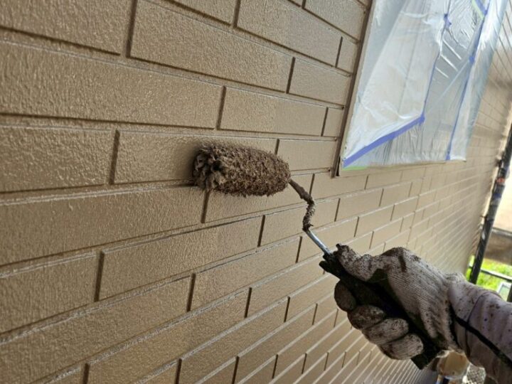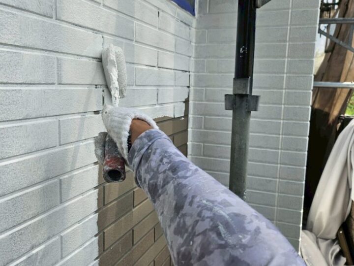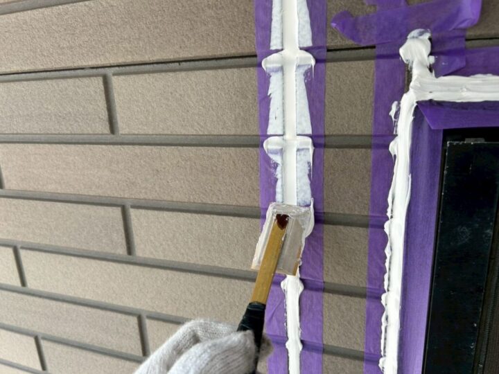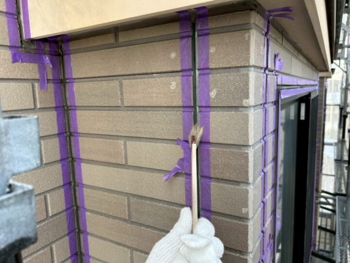 既存シーリングを撤去した個所を養生テープで囲い、プライマーを塗布します。